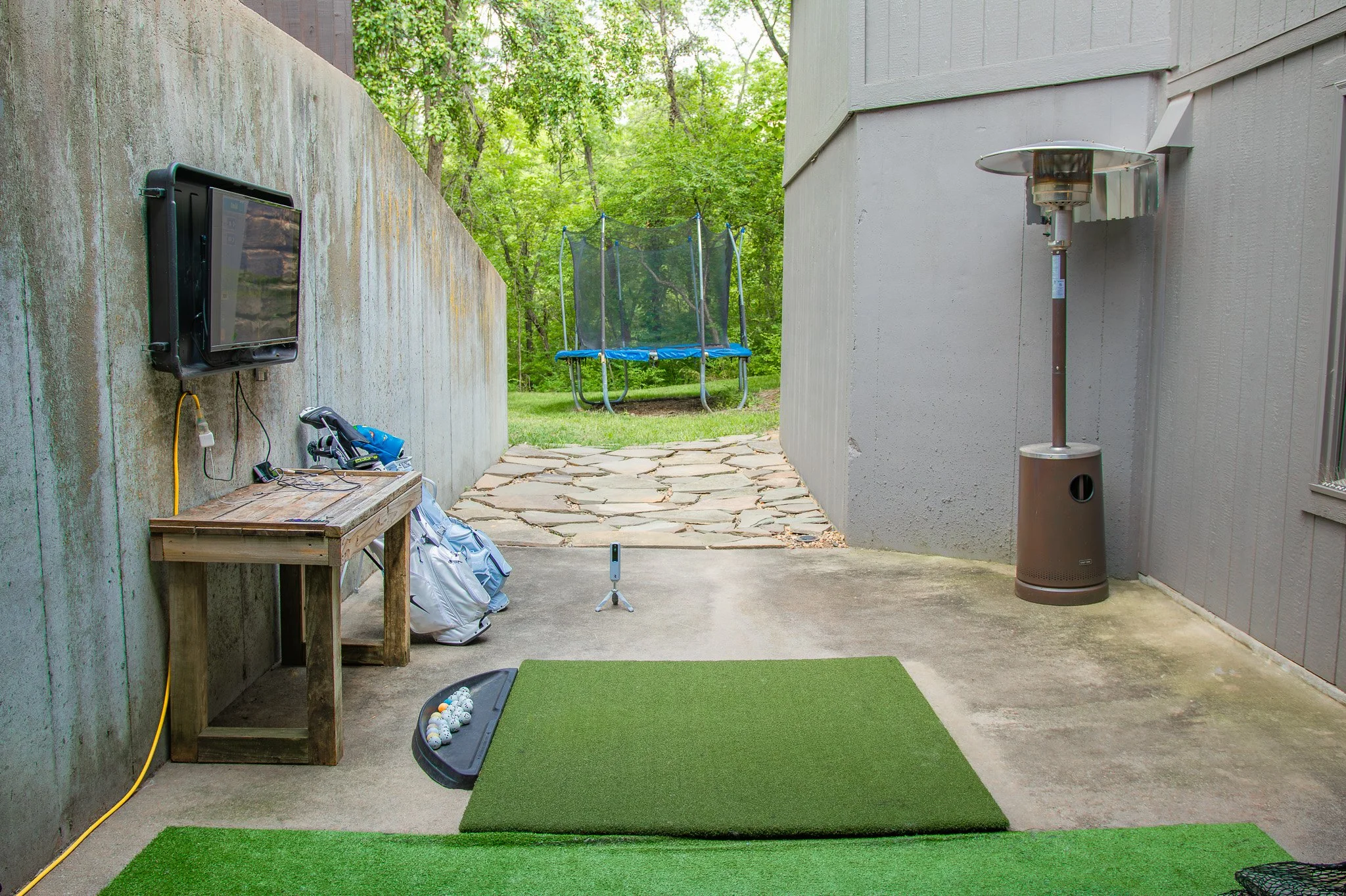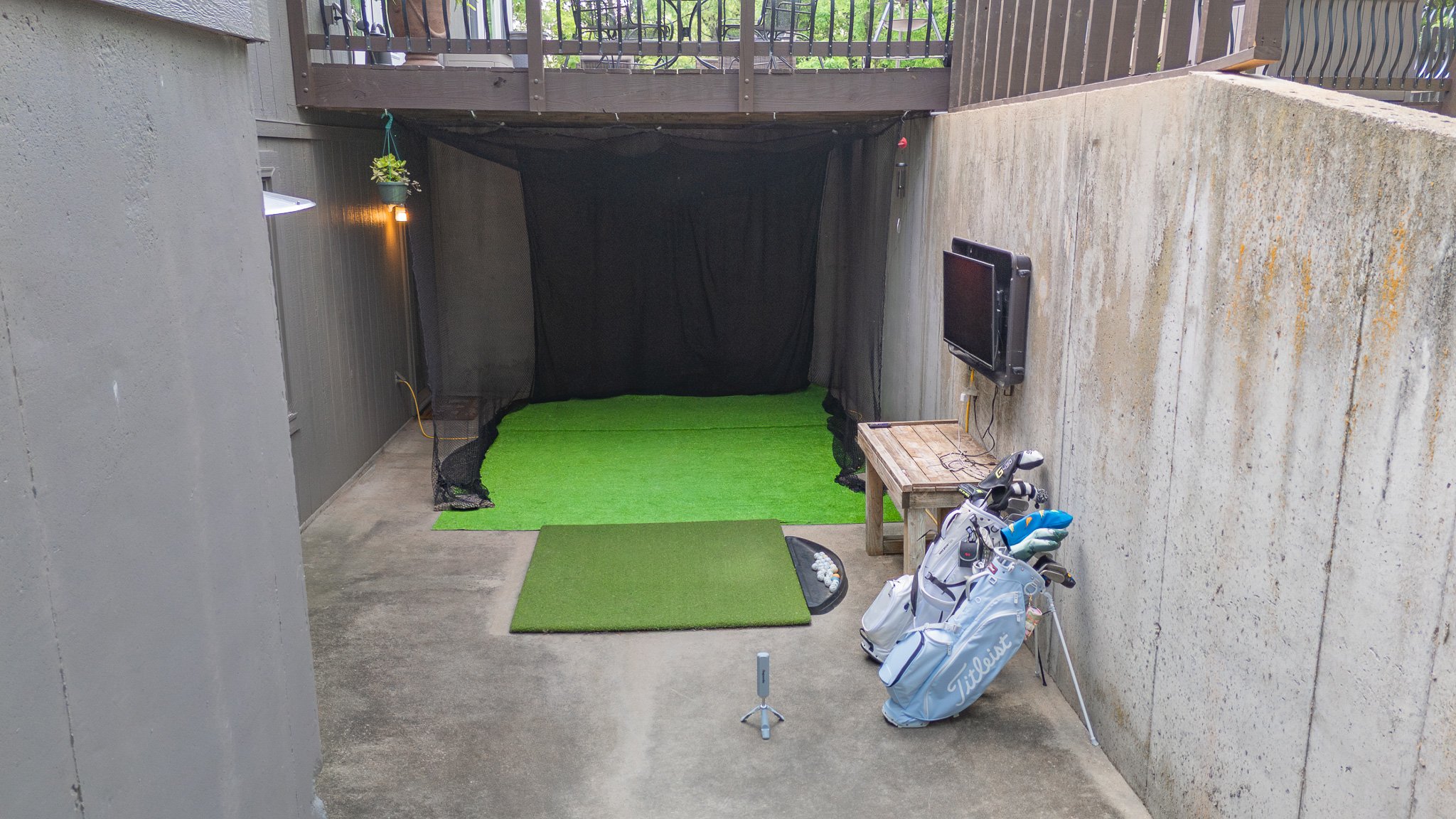 Below the deck we installed a full hitting bay for golf. A Rapasodo golf simulator is used in this area. The TV is mounted to the concrete wall and there is a four-season cover for that TV. It’s ended up being one of our kids favorite areas to hang out in.