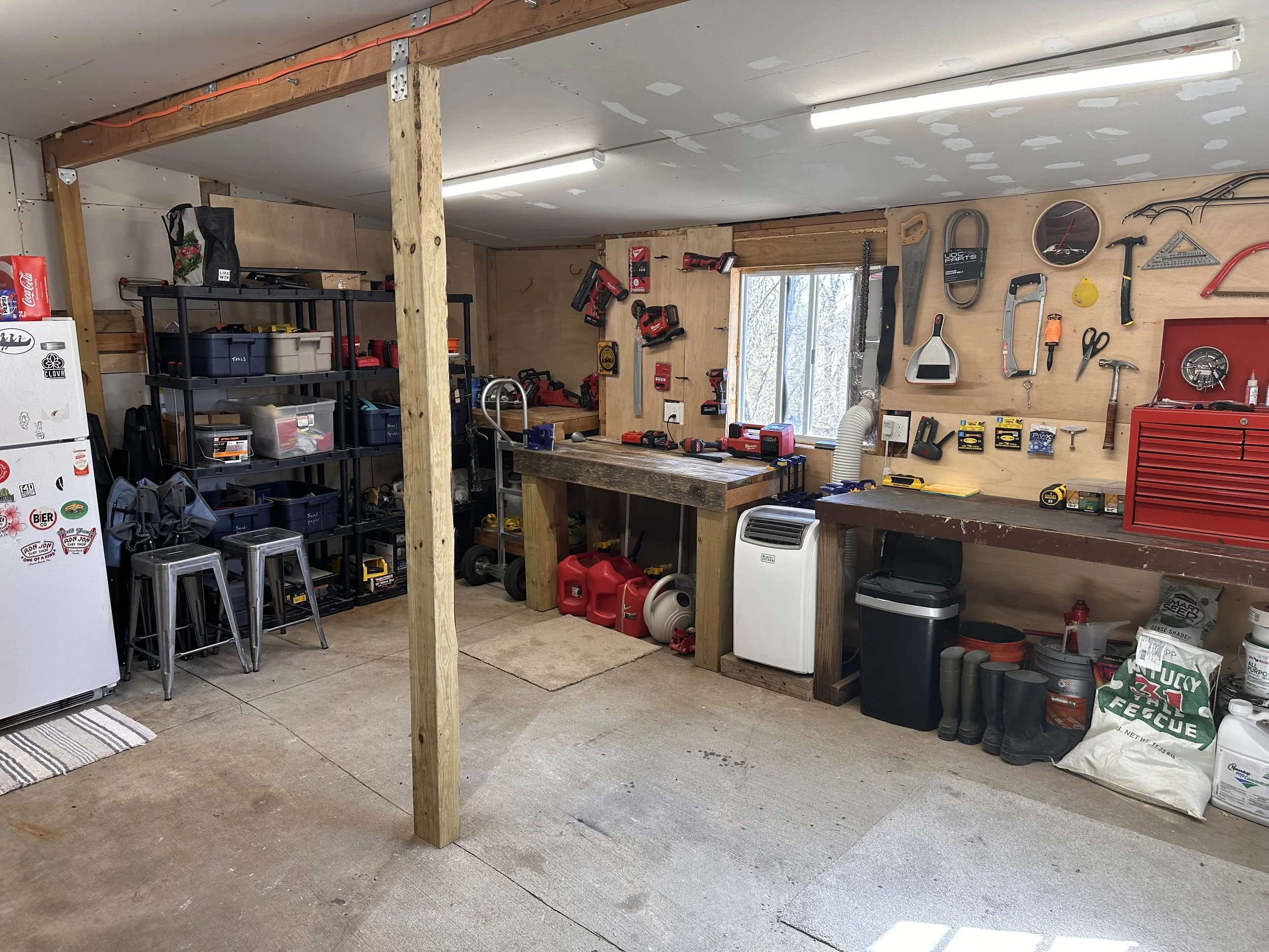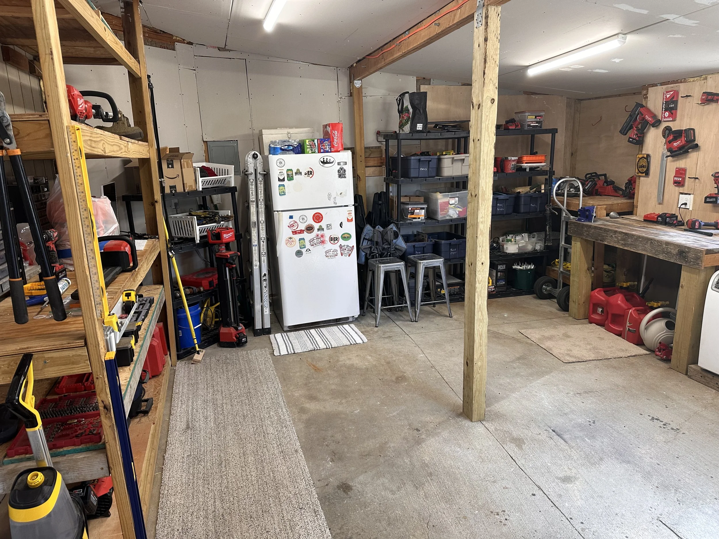 This room was previously neglected, but now it’s one of my husband’s favorite rooms. Beforehand, there were no lights, no plugins, nothing. Just some extension cords from the garage to run anything. Now it has its own electrical box with dedicated lines to the refrigerator, the RV hookups outside, and numerous outlets. It has four LED lights that allow for a ton of lighting while working.