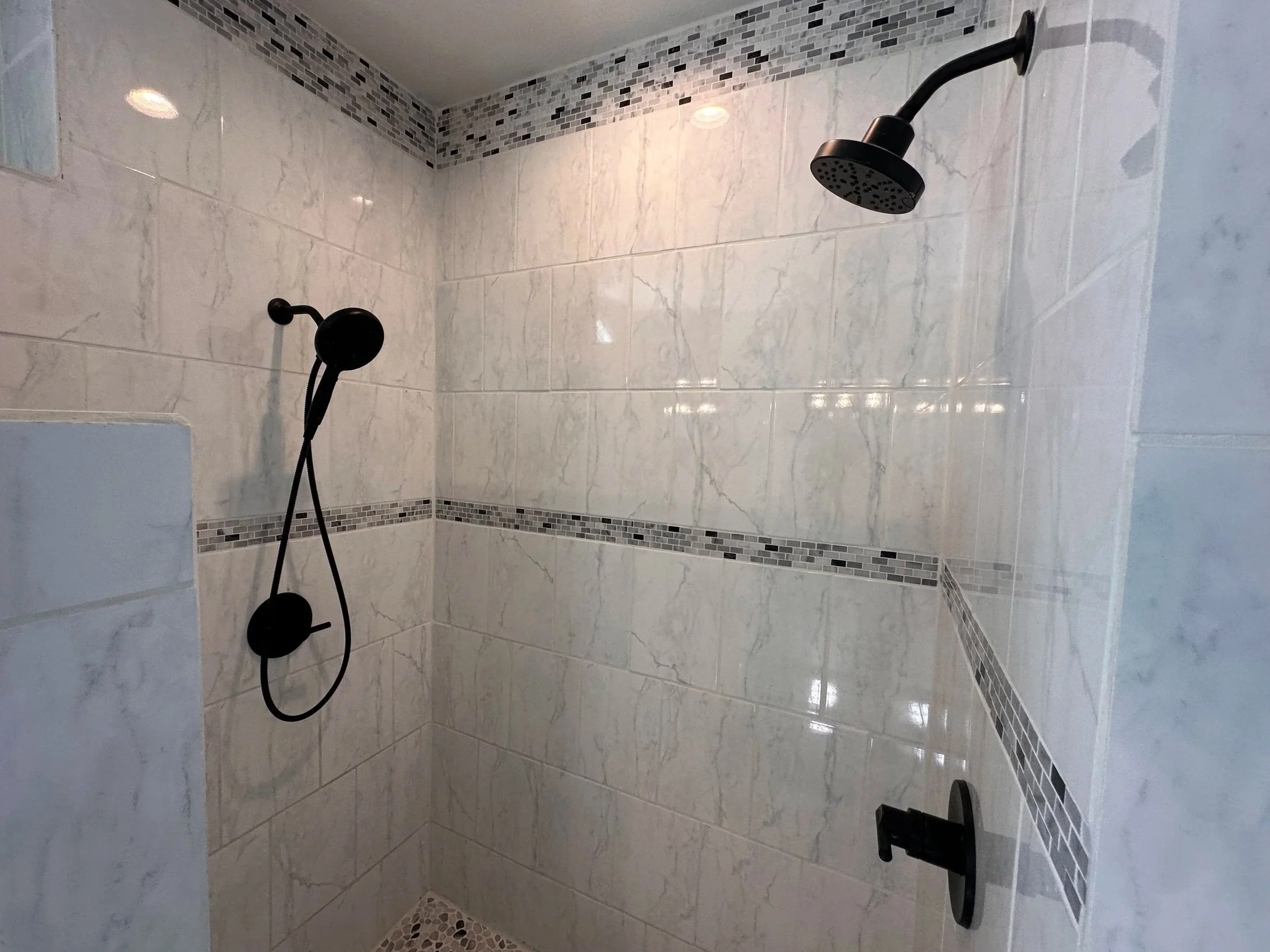 All new fixtures in the master bath. Both showerheads and faucets in the shower area. Both faucets on the double vanity. The floor in the bathroom is also heated.